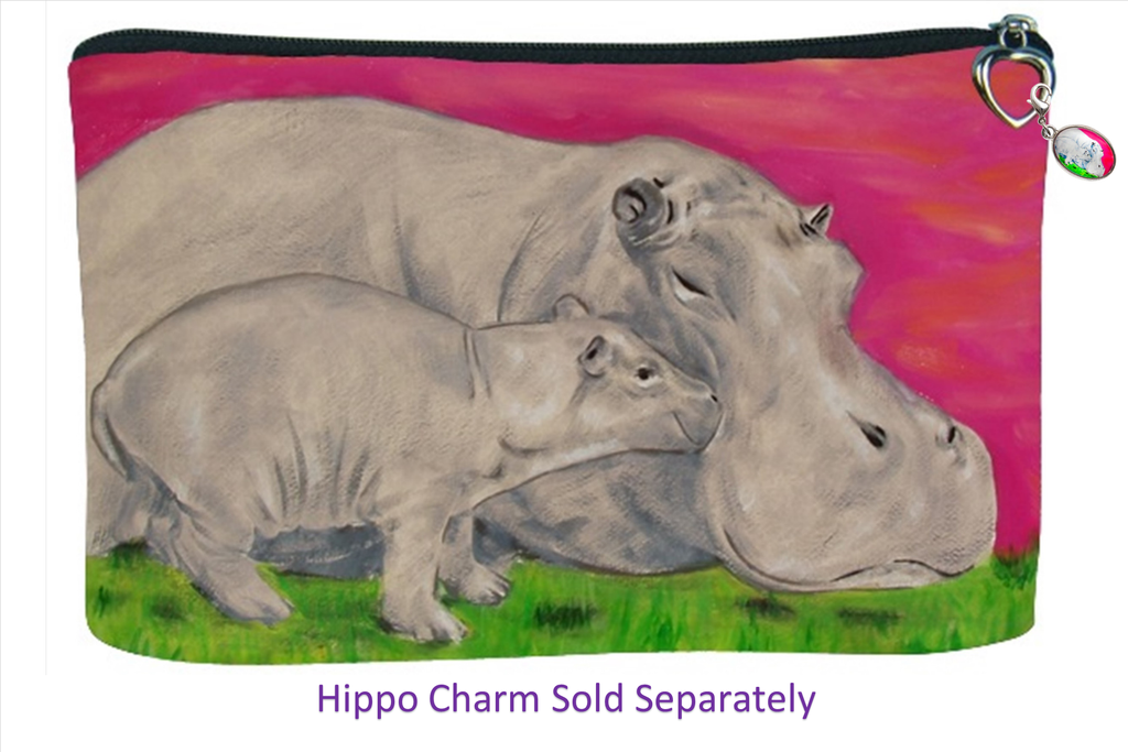 No purse or suitcase is complete without our classic hippo cosmetic bag. It ideal toiletry case for travel or a makeup bag to keep organized. Double Sided Print Water Resistant Microfiber Foam padding Zip top closer Silver-tone heart shaped zipper pull Polyester lining Two inside slip pockets.