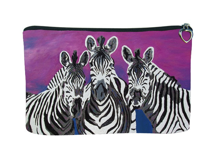 No purse or suitcase is complete without our classic zebra cosmetic bag. It ideal toiletry case for travel or a makeup bag to keep organized. Double Sided Print Water Resistant Microfiber Foam padding Zip top closer Silver-tone heart shaped zipper pull Polyester lining Two inside slip pockets.