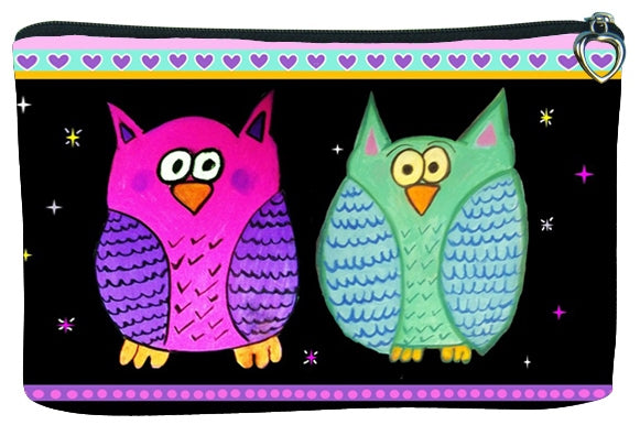 No purse or suitcase is complete without our classic owl cosmetic bag. It ideal toiletry case for travel or a makeup bag to keep organized. Double Sided Print Water Resistant Microfiber Foam padding Zip top closer Silver-tone heart shaped zipper pull Polyester lining Two inside slip pockets.