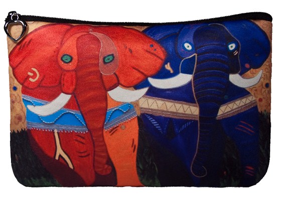 No purse or suitcase is complete without our classic elephant cosmetic bag. It ideal toiletry case for travel or a makeup bag to keep organized. Double Sided Print Water Resistant Microfiber Foam padding Zip top closer Silver-tone heart shaped zipper pull Polyester lining Two inside slip pockets.