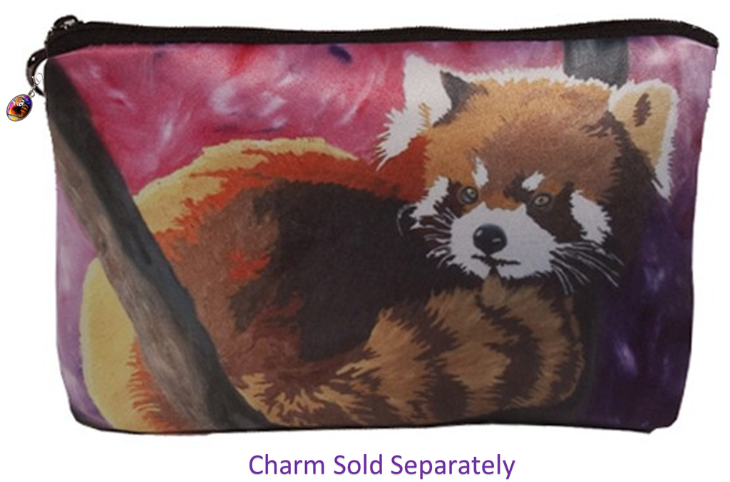 No purse or suitcase is complete without our classic red panda cosmetic bag. It ideal toiletry case for travel or a makeup bag to keep organized. Double Sided Print Water Resistant Microfiber Foam padding Zip top closer Silver-tone heart shaped zipper pull Polyester lining Two inside slip pockets.