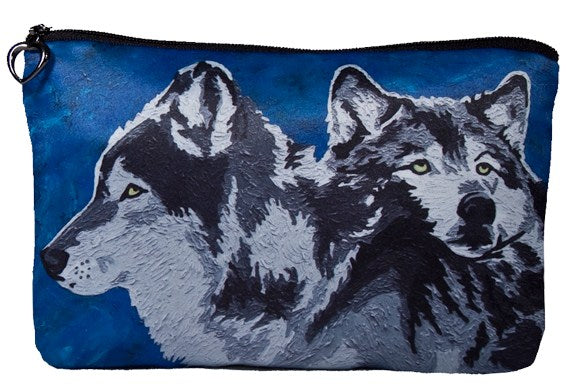 No purse or suitcase is complete without our classic wolves cosmetic bag. It ideal toiletry case for travel or a makeup bag to keep organized. Double Sided Print Water Resistant Microfiber Foam padding Zip top closer Silver-tone heart shaped zipper pull Polyester lining Two inside slip pockets.
