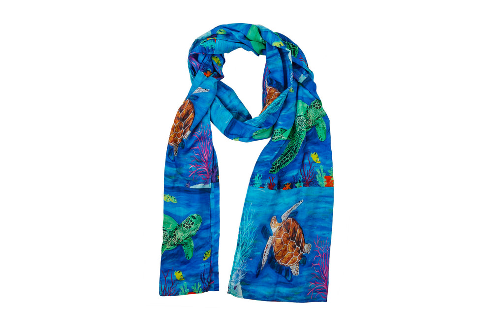 The Salvador Kitti's animal scarf is the purrfect fashionable gift for any animal lover. The scarf is made from luxurious 100% viscose and features the original art of our founder Amy Pugh. Two images, taken from original oil paintings, of a green sea turtle and a loggerhead sea turtle are repeated in panels all over the scarf like a matching patchwork. At 160x45cm, the scarf is long and wide enough to fold several different ways for varying styles. Give the gift of style and art with our unique scarves!