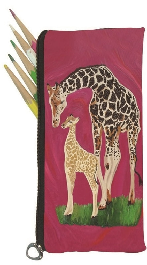 Our giraffe pencil bag is great for your kittens to use at school but also makes a carrier for eyeglasses. This is the ideal size for storing inside a purse or book bag. Water Resistant Microfiber, Double Sided Print, polyester lining, zip top closer, silver-tone heart shaped zipper pull.