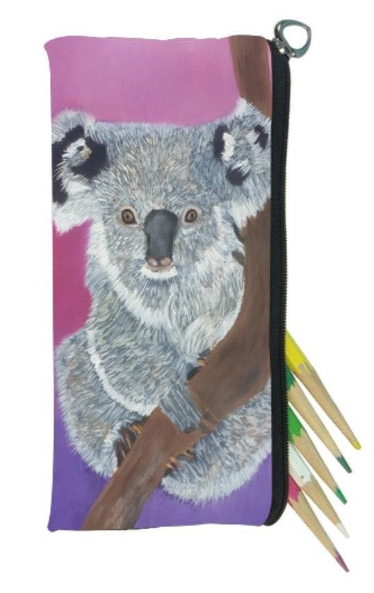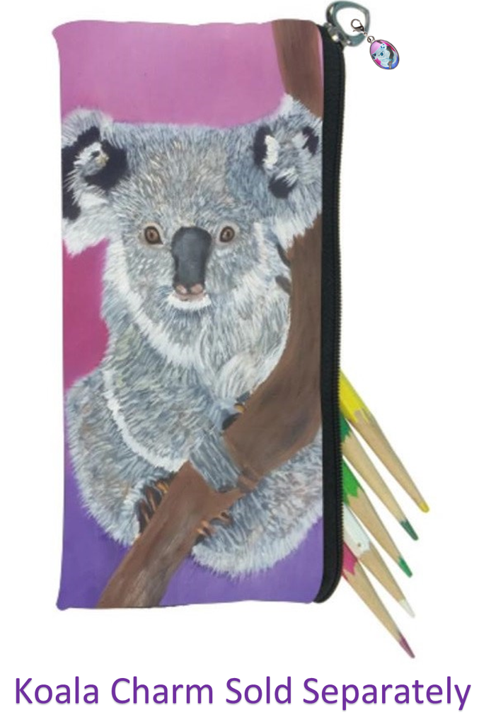 Our koala pencil bag is great for your kittens to use at school but also makes a carrier for eyeglasses. This is the ideal size for storing inside a purse or book bag. Water Resistant Microfiber, Double Sided Print, polyester lining, zip top closer, silver-tone heart shaped zipper pull.