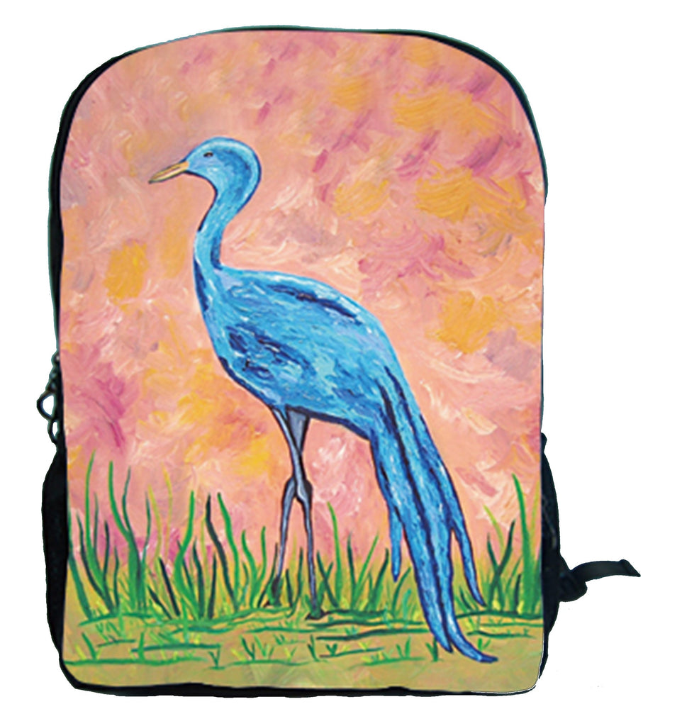 Our blue crane book bag features water resistant microfiber, foam padding, two outside compartments with zippers, two silver circle zipper pulls, adjustable shoulder straps 38-70 cm, top handle, two outer mesh pockets, polyester lining, first compartment includes: zipper pocket with silver-tone circle zipper pull, three pencil pockets, four slip pockets second compartment includes: large foam padded center divide.
