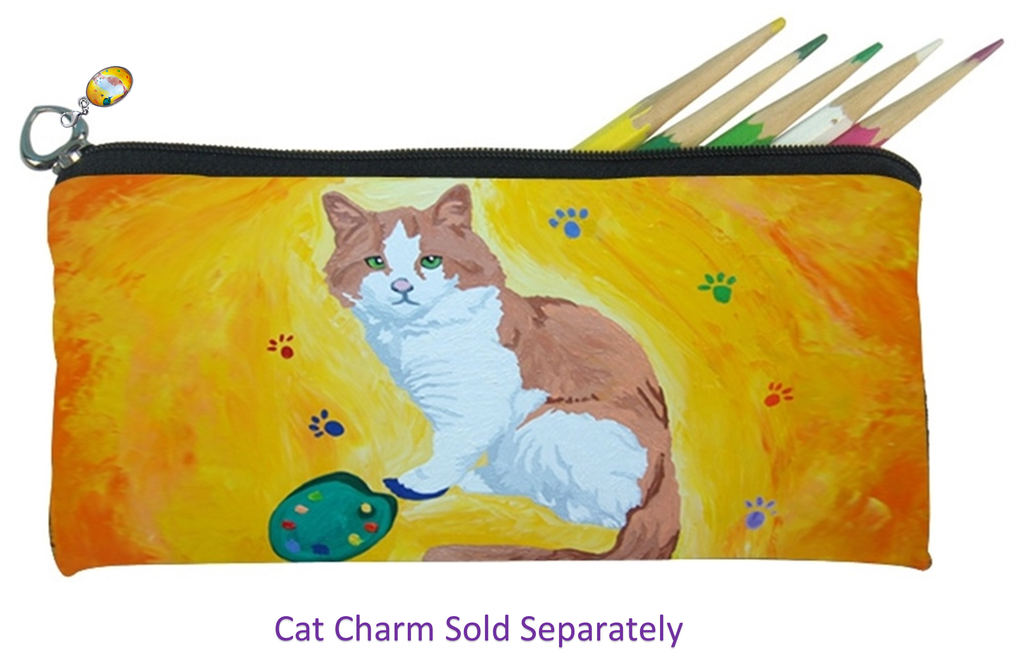 Our cat pencil bag is great for your kittens to use at school but also makes a carrier for eyeglasses. This is the ideal size for storing inside a purse or book bag. Water Resistant Microfiber, Double Sided Print, polyester lining, zip top closer, silver-tone heart shaped zipper pull.