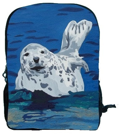 Our seal book bag features water resistant microfiber, foam padding, two outside compartments with zippers, two silver circle zipper pulls, adjustable shoulder straps 38-70 c...