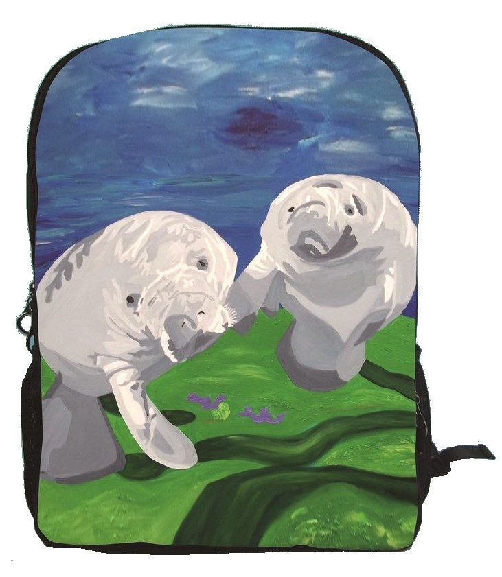 Our manatee book bag features water resistant microfiber, foam padding, two outside compartments with zippers, two silver circle zipper pulls, adjustable shoulder straps 38-7...