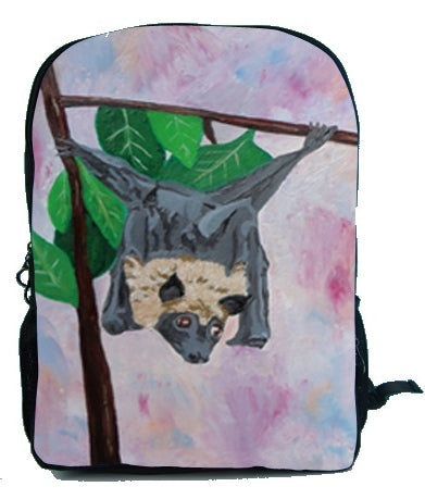 Our bat backpack has water resistant microfiber, foam padding, two outside compartments with zippers, two silver circle zipper pulls, adjustable shoulder straps 38-70 cm, top handle, two outer mesh pockets, polyester lining, first compartment includes: zipper pocket with silver-tone circle zipper pull, three pencil pockets, four slip pockets second compartment includes: large foam padded center divide.