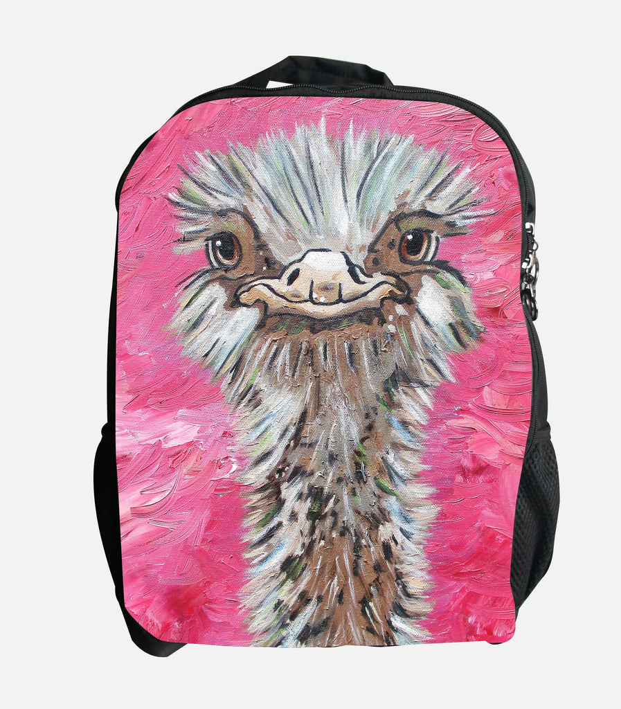 Our Ostrich backpack has water resistant microfiber, foam padding, two outside compartments with zippers, two silver circle zipper pulls, adjustable shoulder straps 38-70 cm, top handle, two outer mesh pockets, polyester lining, first compartment includes: zipper pocket with silver-tone circle zipper pull, three pencil pockets, four slip pockets second compartment includes: large foam padded center divide.