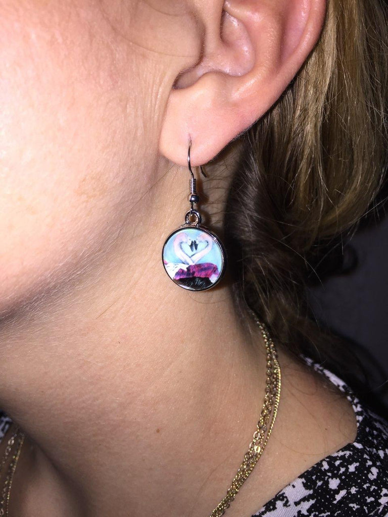 Salvador Kitti flamingo earrings are purrfect wearable art for any animal lover. Pick your favorite animal design or color coordinate with your outfits. This petite earring is light weight and comfortable. The earring is a total length of about 1 1/2 inches. The wide is about 1/2 inch. The charm is a 16mm stainless steal bezel. The front is glass, the back is engraved with the Salvador Kitti logo. Our earrings come with our custom hang-tag, which describes the heart-warming story of the founding of Salvador Kitti.