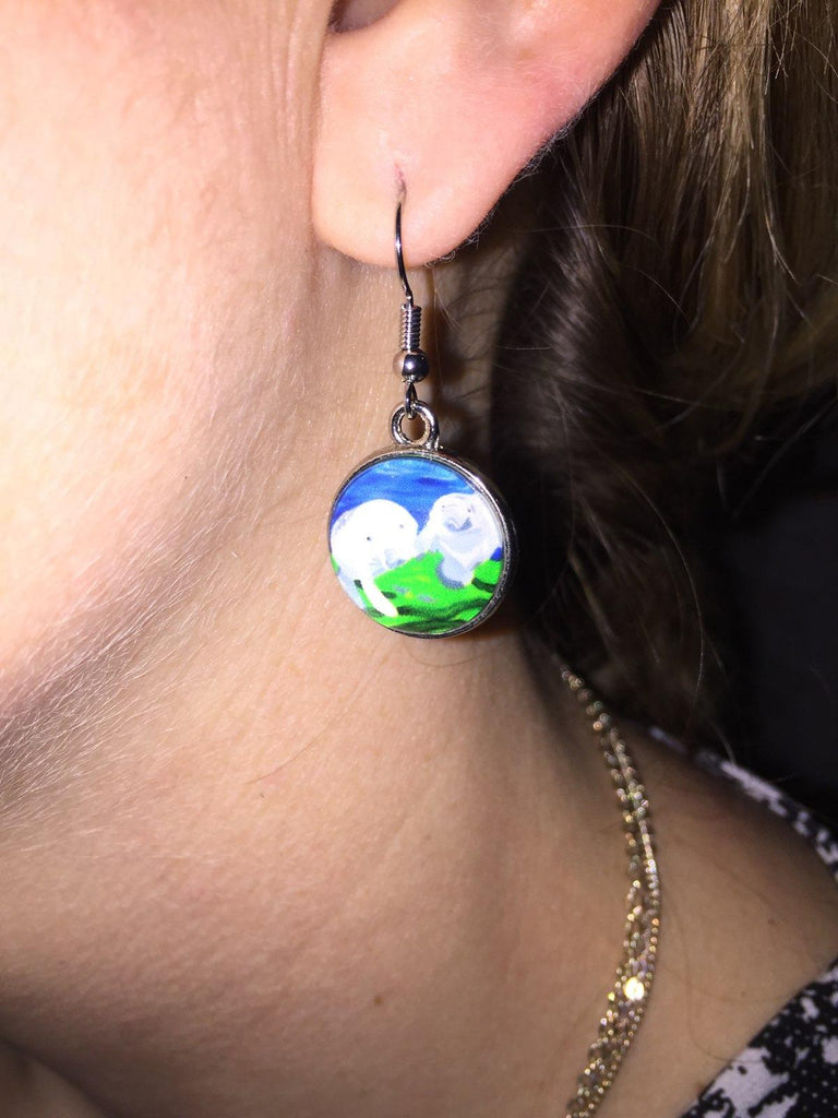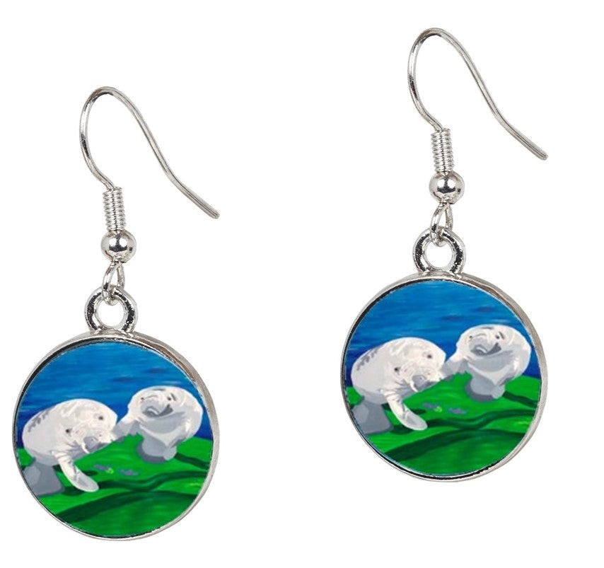Salvador Kitti manatee earrings are purrfect wearable art for any animal lover. Pick your favorite animal design or color coordinate with your outfits. This petite earring is light weight and comfortable. The earring is a total length of about 1 1/2 inches. The wide is about 1/2 inch. The charm is a 16mm stainless steal bezel. The front is glass, the back is engraved with the Salvador Kitti logo. Our earrings come with our custom hang-tag, which describes the heart-warming story of the founding of Salvador Kitti.