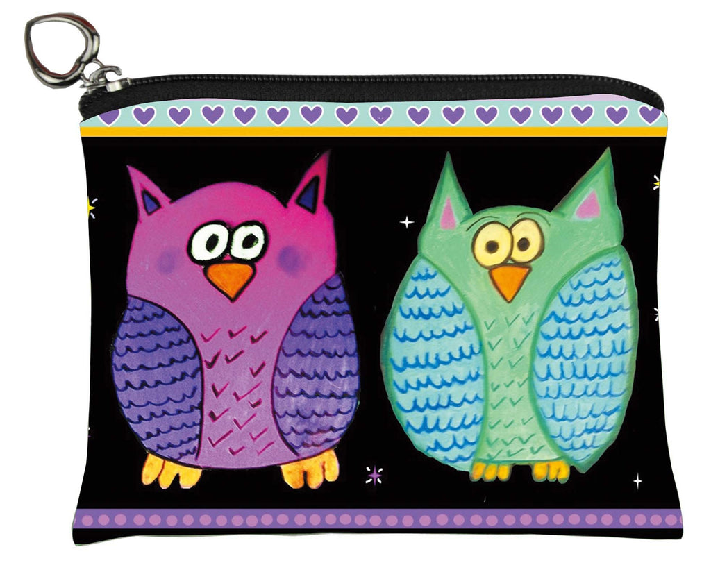 Our classic owl change purse is great for holding actual coins, but also for anything from contact lens to headphones. The purrfect accessory to keep any purse organized Water Resistant Microfiber, Double Sided Print, zip top closer, silver-tone heart shaped zipper pull. 5 x 4 inches, 12 x 9.5 x 1 cm