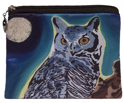 Our classic great horned owl change purse is great for holding actual coins, but also for anything from contact lens to headphones. The purrfect accessory to keep any purse organized Water Resistant Microfiber, Double Sided Print, zip top closer, silver-tone heart shaped zipper pull. 5 x 4 inches, 12 x 9.5 x 1 cm