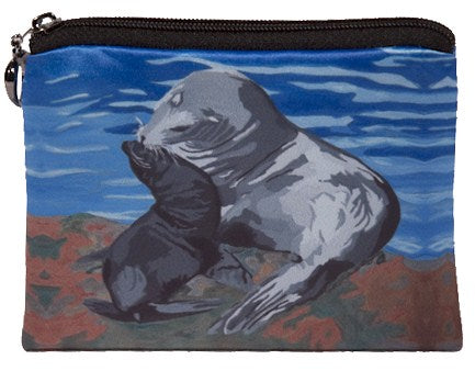 Our classic sea lion change purse is great for holding actual coins, but also for anything from contact lens to headphones. The purrfect accessory to keep any purse organized Water Resistant Microfiber, Double Sided Print, zip top closer, silver-tone heart shaped zipper pull. 5 x 4 inches, 12 x 9.5 x 1 cm