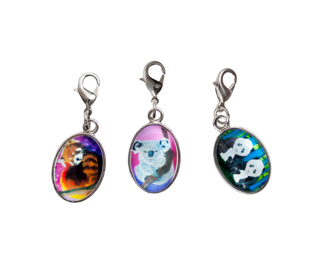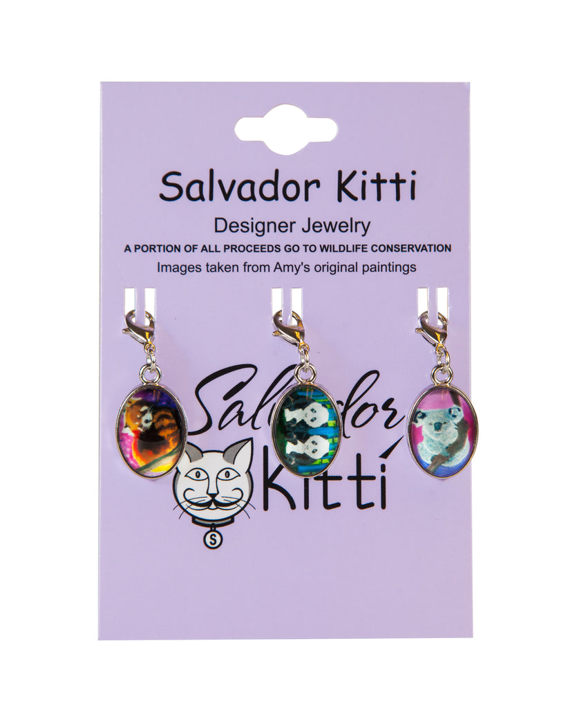 The Salvador Kitti Charm Set is the purrfect colorful accessory for any bear lover. Its 3 charms feature the original art of Amy Pugh; including a Koala Bear, Giant Panda twins, and a Red Panda. The charms have stainless steel backs engraved with the Salvador Kitti logo, lobster claw clasps, and glass cabochon fronts. They can be added to our charm bracelets or as a pop of color to purses and other accessories. Our charm set come with our custom tag, which describes the heart-warming story of the founding of Salvador Kitti.