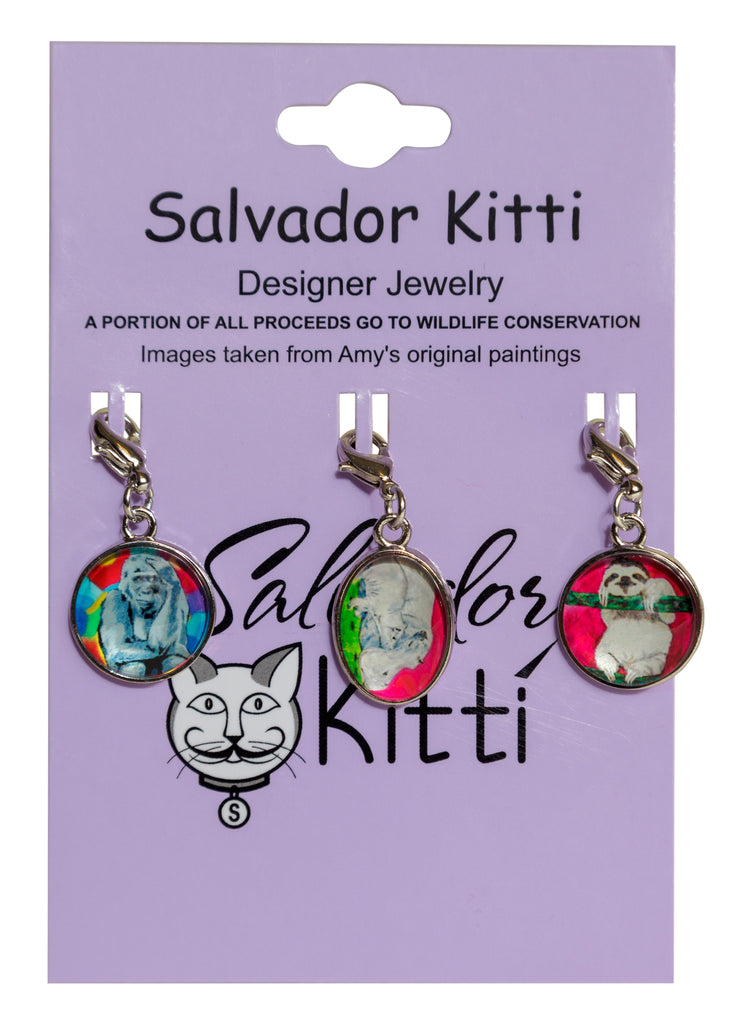 The Salvador Kitti Charm Set is the purrfect colorful accessory for any animal lover. Its 3 charms feature the original art of Amy Pugh; including a Sloth, Gorilla, and Hippos. The charms have stainless steel backs engraved with the Salvador Kitti logo, lobster claw clasps, and glass cabochon fronts. They can be added to our charm bracelets or as a pop of color to purses and other accessories. Our charm set come with our custom tag, which describes the heart-warming story of the founding of Salvador Kitti