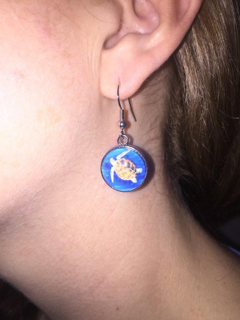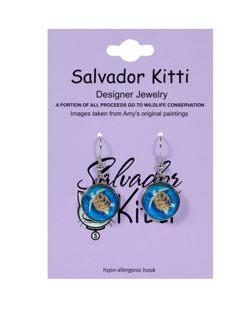 Salvador Kitti earrings are purrfect wearable art for any animal lover. These loggerhead sea turtle earrings earrings feature The Pilgrim"! Pick your favorite animal design or color coordinate with your outfits. This petite earring is light weight and comfortable. The earring is a total length of about 1 1/2 inches. The wide is about 1/2 inch. The charm is a 16mm stainless steal bezel. The front is glass, the back is engraved with the Salvador Kitti logo. Our earrings come with our custom hang-tag, which describes the heart-warming story of the founding of Salvador Kitti.