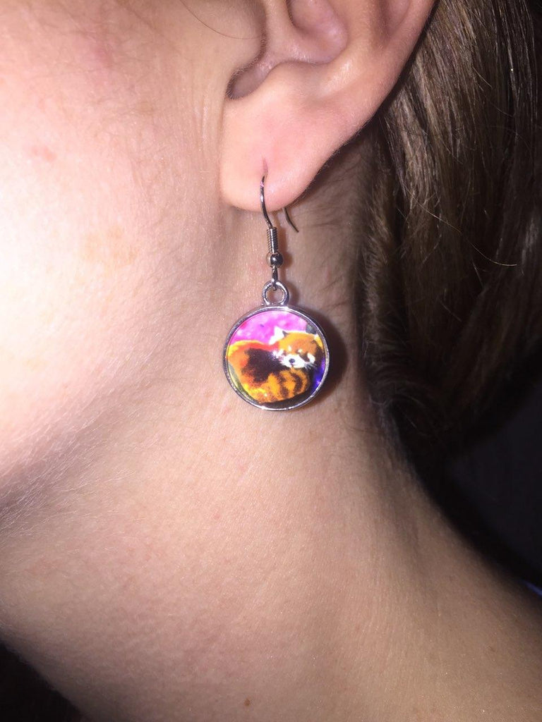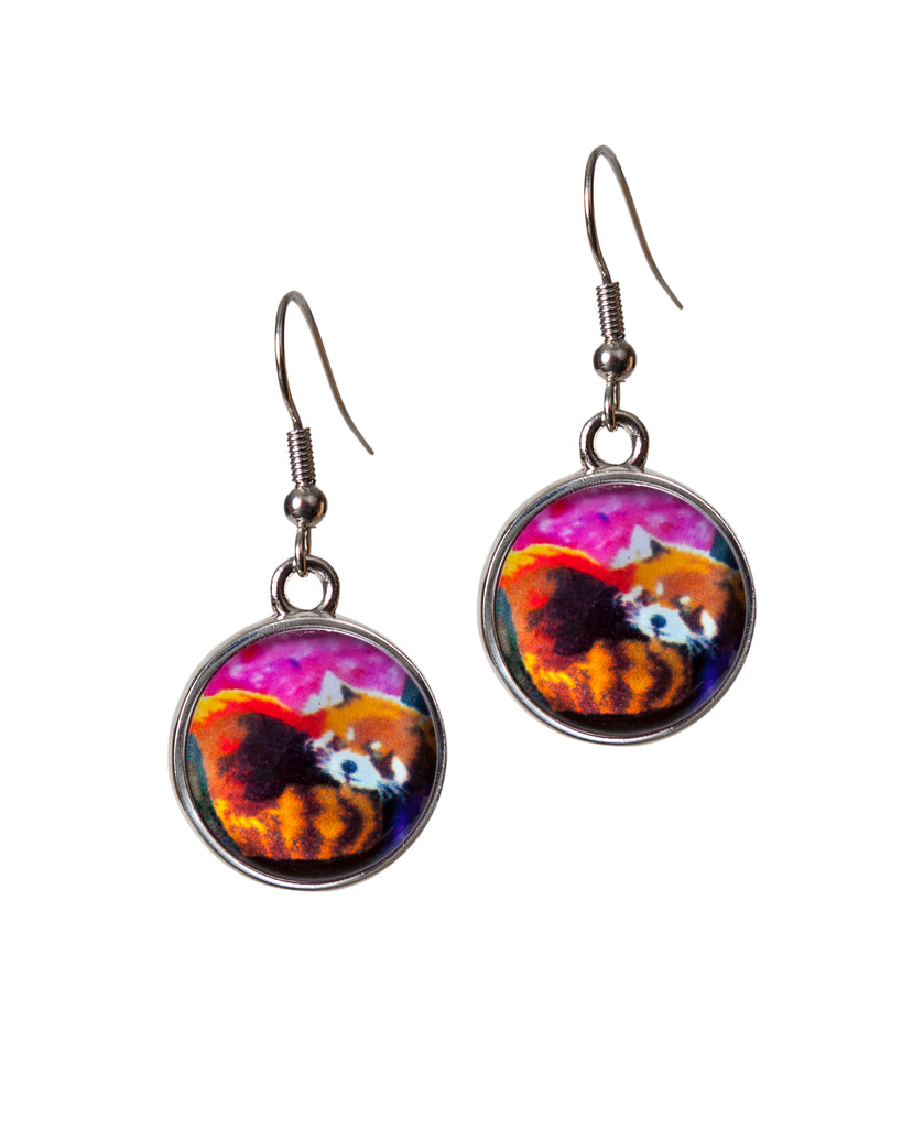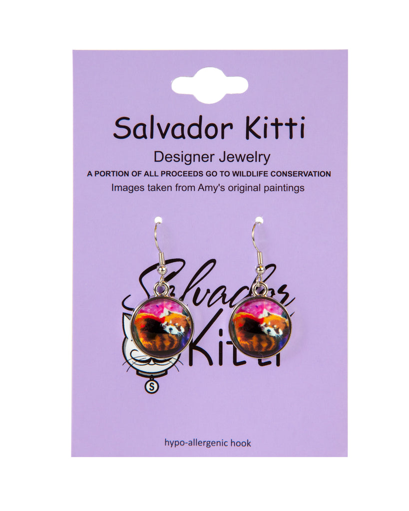 Salvador Kitti red panda earrings are purrfect wearable art for any animal lover. Pick your favorite animal design or color coordinate with your outfits. This petite earring is light weight and comfortable. The earring is a total length of about 1 1/2 inches. The wide is about 1/2 inch. The charm is a 16mm stainless steal bezel. The front is glass, the back is engraved with the Salvador Kitti logo. Our earrings come with our custom hang-tag, which describes the heart-warming story of the founding of Salvador Kitti.