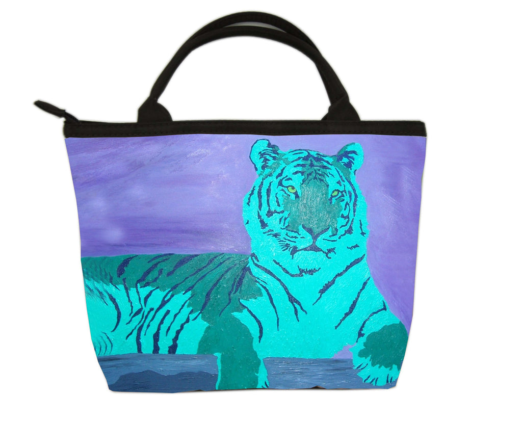 This petite tiger purse is what cool for all the kittens in your life. It can be a cute purse for young girls, or a toiletry bag for all those mature cats. Zippered compartments inside allow for easy organization. Water resistant microfiber, foam padding, zip top closer, microfiber black handle, silver-tone circle zipper pull, polyester lining, inside zip pocket with silver-tone heart zipper pull