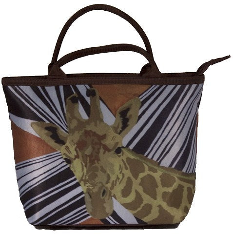 This petite giraffe purse is what cool for all the kittens in your life. It can be a cute purse for young girls, or a toiletry bag for all those mature cats. Zippered compartments inside allow for easy organization. Water resistant microfiber, foam padding, zip top closer, microfiber black handle, silver-tone circle zipper pull, polyester lining, inside zip pocket with silver-tone heart zipper pull.