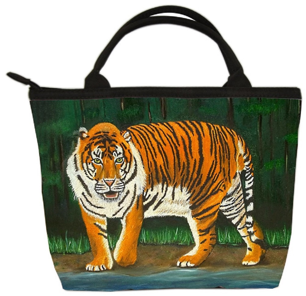 This petite Bengal tiger purse is what cool for all the kittens in your life. It can be a cute purse for young girls, or a toiletry bag for all those mature cats. Zippered compartments inside allow for easy organization. Water resistant microfiber, foam padding, zip top closer, microfiber black handle, silver-tone circle zipper pull, polyester lining, inside zip pocket with silver-tone heart zipper pull.