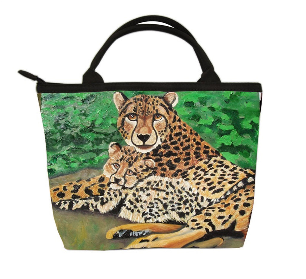 This petite cheetah purse is what cool for all the kittens in your life. It can be a cute purse for young girls, or a toiletry bag for all those mature cats. Zippered compartments inside allow for easy organization. Water resistant microfiber, foam padding, zip top closer, microfiber black handle, silver-tone circle zipper pull, polyester lining, inside zip pocket with silver-tone heart zipper pull.