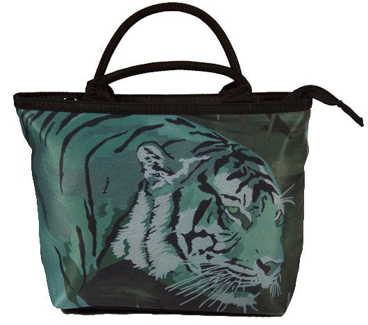This petite Siberian tiger purse is what cool for all the kittens in your life. It can be a cute purse for young girls, or a toiletry bag for all those mature cats. Zippered compartments inside allow for easy organization. Water resistant microfiber, foam padding, zip top closer, microfiber black handle, silver-tone circle zipper pull, polyester lining, inside zip pocket with silver-tone heart zipper pull.