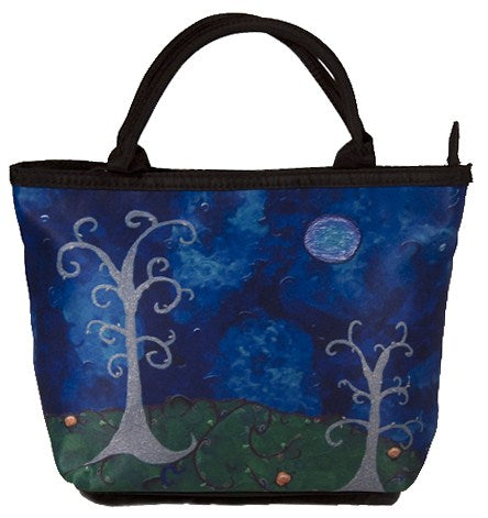 This petite whimsical trees purse is what cool for all the kittens in your life. It can be a cute purse for young girls, or a toiletry bag for all those mature cats. Zippered compartments inside allow for easy organization. Water resistant microfiber, foam padding, zip top closer, microfiber black handle, silver-tone circle zipper pull, polyester lining, inside zip pocket with silver-tone heart zipper pull.