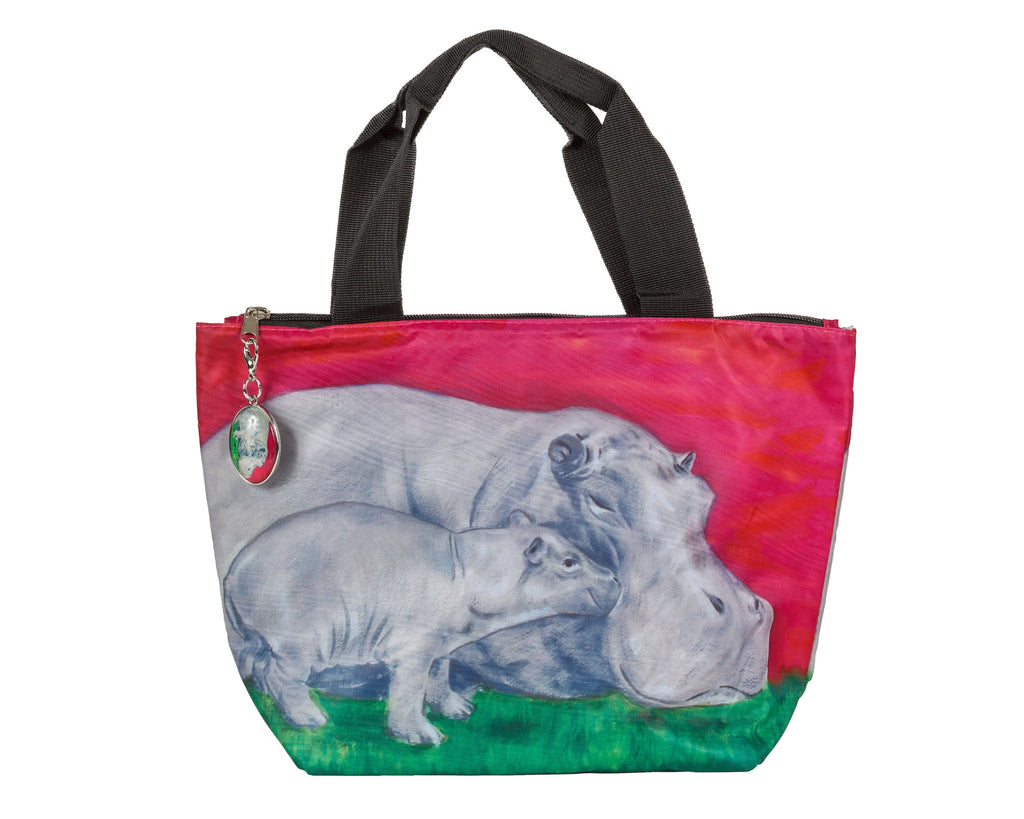 Keep your food and drinks fresh in style with our hippo lunch bag. Suitable for meals, snacks, or drink, the lunch bag insulated so cold and warm items stay warm. Take your goodies to school or work in unique and artistic style Polyester, Fully insulated, silver foil lining, zip top closer, polyester double handle, Silver-tone zipper, matching detachable zipper charm.