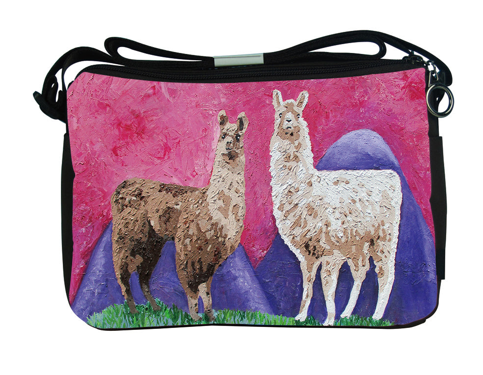 Our stylish modern llama messenger can meet a wide variety of needs. With its two separate inner compartments, and further zippered pockets inside, it can be an ideal bag for tourist or for outdoor activities. It features an adjustable strap that can be worn over the shoulder or cross-body. It can also be a great everyday purse for those that like lots of storage room and lots of separate compartments for organizing. Water resistant microfiber, foam padding, two outside main compartment with zip top closers , two silver-tone circle zipper pull, adjustable shoulder strap, polyester lining, inside zip pocket with silver-tone heart zipper pull, cell phone pocket, two side slip pockets on outside.