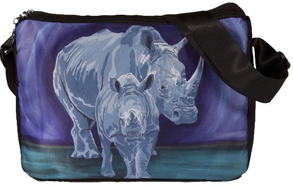 Our stylish modern rhino messenger can meet a wide variety of needs. With its two separate inner compartments, and further zippered pockets inside, it can be an ideal bag for tourist or for outdoor activities. It features an adjustable strap that can be worn over the shoulder or cross-body. It can also be a great everyday purse for those that like lots of storage room and lots of separate compartments for organizing. Water resistant microfiber, foam padding, two outside main compartment with zip top closers , two silver-tone circle zipper pull, adjustable shoulder strap, polyester lining, inside zip pocket with silver-tone heart zipper pull, cell phone pocket, two side slip pockets on outside.