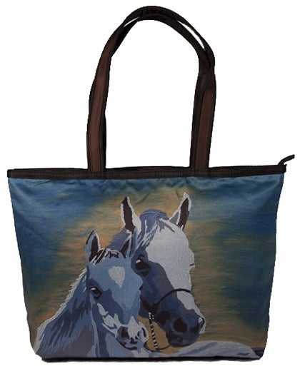 Our horse tote is the purrfect way to carry just about anything. Use it for your everyday handbag. The large handles allows for it to be wore over the shoulder or carried by the hand. Zippered compartments on the inside allow for easy organization. The water resistant microfiber allows for the image, taken from original oil paintings to pop with amazing detail and color Water resistant microfiber,foam padding, zip top closer, two-tone handle, silver-tone circle zipper pull, polyester lining, inside zip pocket with silver-tone heart zipper pull , cell phone pocket, slit pocket.