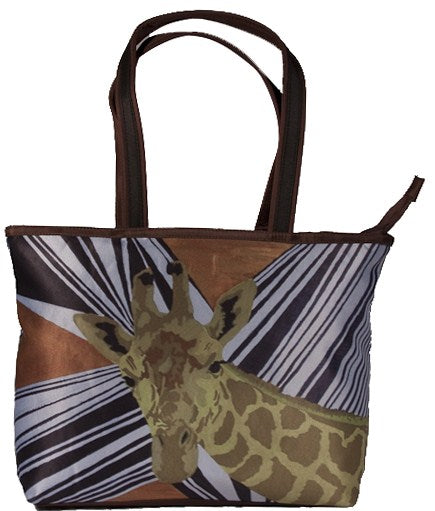 Our animal print tote is the purrfect way to carry just about anything. Use it for your everyday handbag. The large handles allows for it to be wore over the shoulder or carried by the hand. Zippered compartments on the inside allow for easy organization. The water resistant microfiber allows for the image, taken from original oil paintings to pop with amazing detail and color Water resistant microfiber,foam padding, zip top closer, two-tone handle, silver-tone circle zipper pull, polyester lining, inside zip pocket with silver-tone heart zipper pull , cell phone pocket, slit pocket.