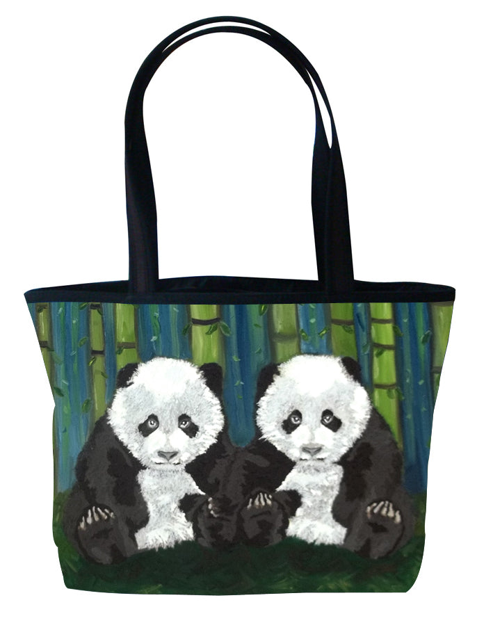 Our panda cubs tote is the purrfect way to carry just about anything. Use it for your everyday handbag. The large handles allows for it to be wore over the shoulder or carried by the hand. Zippered compartments on the inside allow for easy organization. The water resistant microfiber allows for the image, taken from original oil paintings to pop with amazing detail and color Water resistant microfiber,foam padding, zip top closer, two-tone handle, silver-tone circle zipper pull, polyester lining, inside zip pocket with silver-tone heart zipper pull , cell phone pocket, slit pocket.