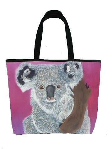 Our koala tote is the purrfect way to carry just about anything. Use it for your everyday handbag. The large handles allows for it to be wore over the shoulder or carried by the hand. Zippered compartments on the inside allow for easy organization. The water resistant microfiber allows for the image, taken from original oil paintings to pop with amazing detail and color Water resistant microfiber,foam padding, zip top closer, two-tone handle, silver-tone circle zipper pull, polyester lining, inside zip pocket with silver-tone heart zipper pull , cell phone pocket, slit pocket.