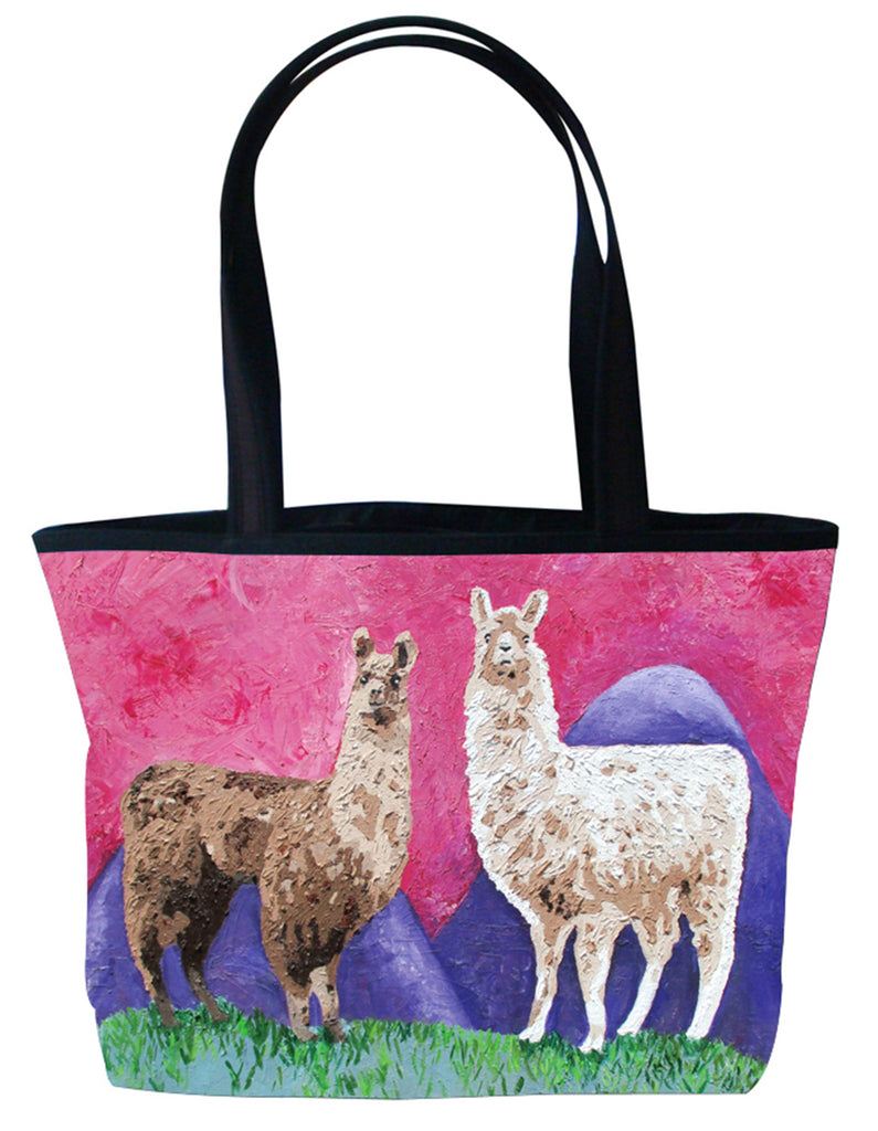 Our llama tote is the purrfect way to carry just about anything. Use it for your everyday handbag. The large handles allows for it to be wore over the shoulder or carried by the hand. Zippered compartments on the inside allow for easy organization. The water resistant microfiber allows for the image, taken from original oil paintings to pop with amazing detail and color Water resistant microfiber,foam padding, zip top closer, two-tone handle, silver-tone circle zipper pull, polyester lining, inside zip pocket with silver-tone heart zipper pull , cell phone pocket, slit pocket.