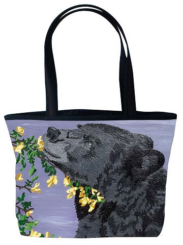 Our black bear tote is the purrfect way to carry just about anything. Use it for your everyday handbag. The large handles allows for it to be wore over the shoulder or carried by the hand. Zippered compartments on the inside allow for easy organization. The water resistant microfiber allows for the image, taken from original oil paintings to pop with amazing detail and color Water resistant microfiber,foam padding, zip top closer, two-tone handle, silver-tone circle zipper pull, polyester lining, inside zip pocket with silver-tone heart zipper pull , cell phone pocket, slit pocket.