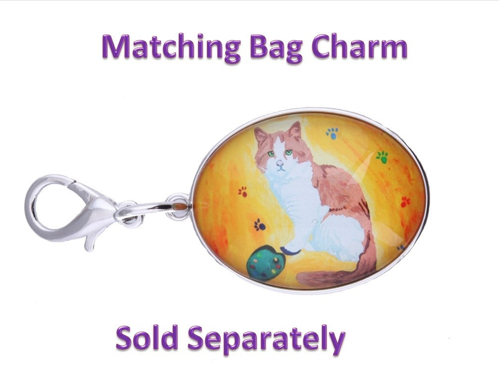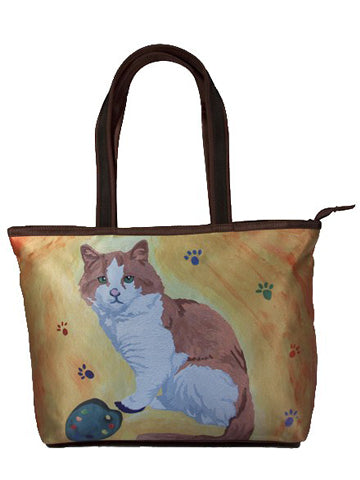 Our cat tote is the purrfect way to carry just about anything. Use it for your everyday handbag. The large handles allows for it to be wore over the shoulder or carried by the hand. Zippered compartments on the inside allow for easy organization. The water resistant microfiber allows for the image, taken from original oil paintings to pop with amazing detail and color Water resistant microfiber,foam padding, zip top closer, two-tone handle, silver-tone circle zipper pull, polyester lining, inside zip pocket with silver-tone heart zipper pull , cell phone pocket, slit pocket.