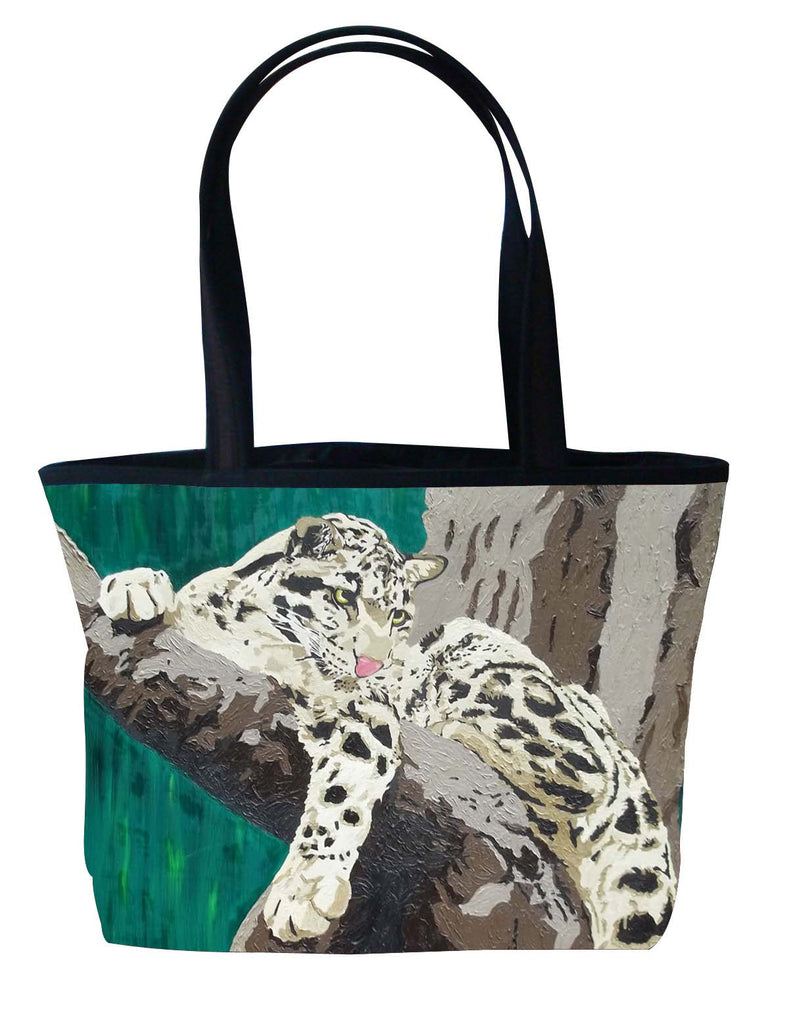 Our clouded leopard tote is the purrfect way to carry just about anything. Use it for your everyday handbag. The large handles allows for it to be wore over the shoulder or carried by the hand. Zippered compartments on the inside allow for easy organization. The water resistant microfiber allows for the image, taken from original oil paintings to pop with amazing detail and color Water resistant microfiber,foam padding, zip top closer, two-tone handle, silver-tone circle zipper pull, polyester lining, inside zip pocket with silver-tone heart zipper pull , cell phone pocket, slit pocket.