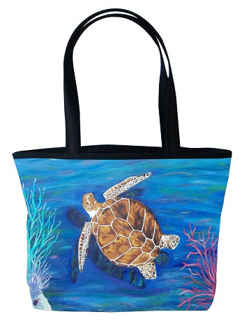 Our loggerhead sea turtle tote is the purrfect way to carry just about anything. Use it for your everyday handbag. The large handles allows for it to be wore over the shoulder or carried by the hand. Zippered compartments on the inside allow for easy organization. The water resistant microfiber allows for the image, taken from original oil paintings to pop with amazing detail and color Water resistant microfiber,foam padding, zip top closer, two-tone handle, silver-tone circle zipper pull, polyester lining, inside zip pocket with silver-tone heart zipper pull , cell phone pocket, slit pocket.