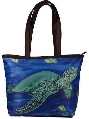 Our sea turtle tote is the purrfect way to carry just about anything. Use it for your everyday handbag. The large handles allows for it to be wore over the shoulder or carried by the hand. Zippered compartments on the inside allow for easy organization. The water resistant microfiber allows for the image, taken from original oil paintings to pop with amazing detail and color Water resistant microfiber,foam padding, zip top closer, two-tone handle, silver-tone circle zipper pull, polyester lining, inside zip pocket with silver-tone heart zipper pull , cell phone pocket, slit pocket.