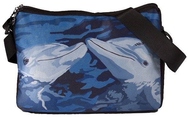 Our stylish modern dolphin messenger can meet a wide variety of needs. With its two separate inner compartments, and further zippered pockets inside, it can be an ideal bag for tourist or for outdoor activities. It features an adjustable strap that can be worn over the shoulder or cross-body. It can also be a great everyday purse for those that like lots of storage room and lots of separate compartments for organizing. Water resistant microfiber, foam padding, two outside main compartment with two top closer , two silver-tone circle zipper pull, adjustable shoulder strap, polyester lining, inside zip pocket with silver-tone heart zipper pull, cell phone pocket, two side slip pockets on outside.