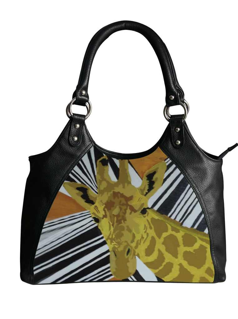 Our Giraffe Retro Cat vegan leather bag is fashion forward, versatile, and stylish, It purrfect for an everyday purse. The straps are large enough to wear over the shoulder. The straps and outer portions are made of high-quality vegan leather in black, while the center portion containing the print is made of water resistant microfiber. The microfiber allows for our signature images, taken from original oil paintings, to pop with dynamic color and vibrancy. They feature over-sized silver-tone hardware and multiple pockets. Butter soft vegan leather, double vegan leather shoulder strap, microfiber front, zip top closer, outside zip compartment, large silver-tone hardware, polyester lining, inside zip pocket, cell phone pocket. 12 x 15 x 4 inches, 30 x 38 x 10 cm