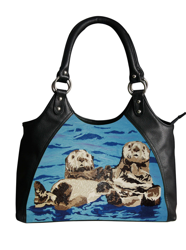 Our Retro Cat vegan leather sea otter bag is fashion forward, versatile, and stylish, It purrfect for an everyday purse. The straps are large enough to wear over the shoulder. The straps and outer portions are made of high-quality vegan leather in black, while the center portion containing the print is made of water resistant microfiber. The microfiber allows for our signature images, taken from original oil paintings, to pop with dynamic color and vibrancy. They feature over-sized silver-tone hardware and multiple pockets. Butter soft vegan leather, double vegan leather shoulder strap, microfiber front, zip top closer, outside zip compartment, large silver-tone hardware, polyester lining, inside zip pocket, cell phone pocket. 12 x 15 x 4 inches, 30 x 38 x 10 cm