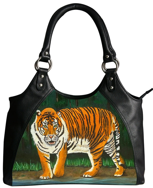 Our Retro Cat vegan leather tiger bag is fashion forward, versatile, and stylish, It purrfect for an everyday purse. The straps are large enough to wear over the shoulder. The straps and outer portions are made of high-quality vegan leather in black, while the center portion containing the print is made of water resistant microfiber. The microfiber allows for our signature images, taken from original oil paintings, to pop with dynamic color and vibrancy. They feature over-sized silver-tone hardware and multiple pockets. Butter soft vegan leather, double vegan leather shoulder strap, microfiber front, zip top closer, outside zip compartment, large silver-tone hardware, polyester lining, inside zip pocket, cell phone pocket. 12 x 15 x 4 inches, 30 x 38 x 10 cm