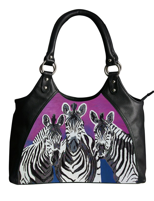 Our Retro Cat vegan leather zebra bag is fashion forward, versatile, and stylish, It purrfect for an everyday purse. The straps are large enough to wear over the shoulder. The straps and outer portions are made of high-quality vegan leather in black, while the center portion containing the print is made of water resistant microfiber. The microfiber allows for our signature images, taken from original oil paintings, to pop with dynamic color and vibrancy. They feature over-sized silver-tone hardware and multiple pockets. Butter soft vegan leather, double vegan leather shoulder strap, microfiber front, zip top closer, outside zip compartment, large silver-tone hardware, polyester lining, inside zip pocket, cell phone pocket. 12 x 15 x 4 inches, 30 x 38 x 10 cm