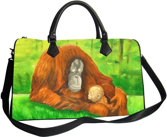 Our butter soft vegan leather orangutan bag is the ultimate in luxury for all those posh kittens out there. It features a detachable shoulder strap that is also adjustable for versatility. It has a footed bottom, protecting it from dirt and from getting torn when set down, and which also keeps the bag upright and maintains it shape when set down. Zippered compartments inside allows for easy organization. It is made of an ultra-sturdy water-resistant microfiber which allows for the image, taken from original oil paintings to pop with amazing detail and color. Butter soft vegan leather,detachable adjustable vegan leather shoulder strap, vegan leather handles with whip detail, double sided microfiber print, zip top closer, two outside pockets, silver-tone zipper pull polyester lining, inside zip pocket, cell phone pocket, footed bottom.