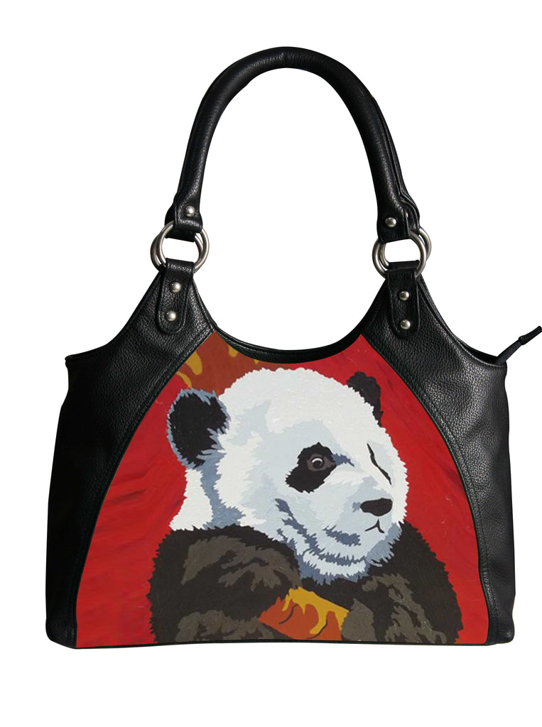 Our Retro Cat vegan leather panda bag is fashion forward, versatile, and stylish, It purrfect for an everyday purse. The straps are large enough to wear over the shoulder. The straps and outer portions are made of high-quality vegan leather in black, while the center portion containing the print is made of water resistant microfiber. The microfiber allows for our signature images, taken from original oil paintings, to pop with dynamic color and vibrancy. They feature over-sized silver-tone hardware and multiple pockets. Butter soft vegan leather, double vegan leather shoulder strap, microfiber front, zip top closer, outside zip compartment, large silver-tone hardware, polyester lining, inside zip pocket, cell phone pocket. 12 x 15 x 4 inches, 30 x 38 x 10 cm